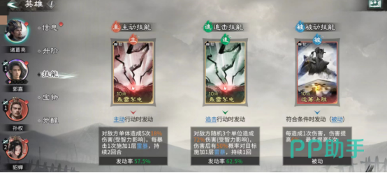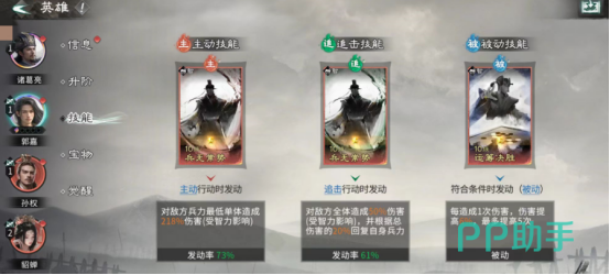 但是选择了这三种人物角色之后,还需要合理排兵布阵,正确放置在合适的位置上,才能将抗击打能力以及抗伤害能力发挥到极致,就比如诸葛亮需要放在最前排,另外两位人物角色就要站在诸葛亮的身后,能够将孙权的天赋技能发挥出来,在不同的战场模式当中,都可给自己的队友造成四维的属性加成。其次,就算自己的队友遭受到敌人的攻击时,也会有很大的几率可以快速恢复兵力。其实此阵营当中不得不承认郭嘉的天赋也是非常出色的,善于和敌方阵营斗智斗勇,来一场智力比拼。