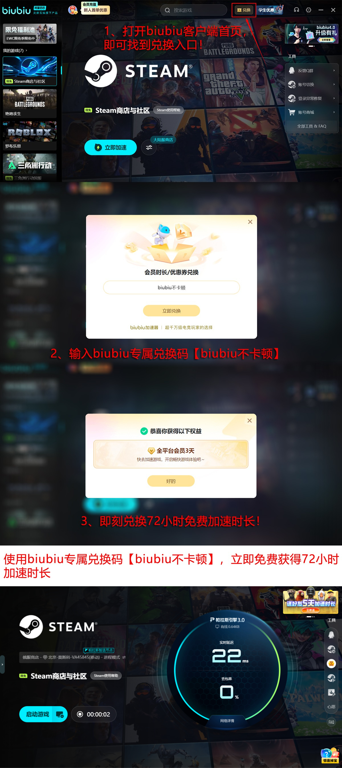 其底层采用运营商级电竞专线,具备毫秒级路由收敛能力与QoS优先调度策略,已被Pero电子竞技战队正式列为赛事指定网络加速方案。新用户首次注册即可获赠24小时全功能试用权限;所有用户输入兑换码【biubiu不卡顿】还可额外激活72小时加速时长,累计达96小时。该额度不仅适用于《前往中世纪》等Steam单机游戏下载,亦可覆盖《原神》《崩坏:星穹铁道》等大型网游的资源更新场景。