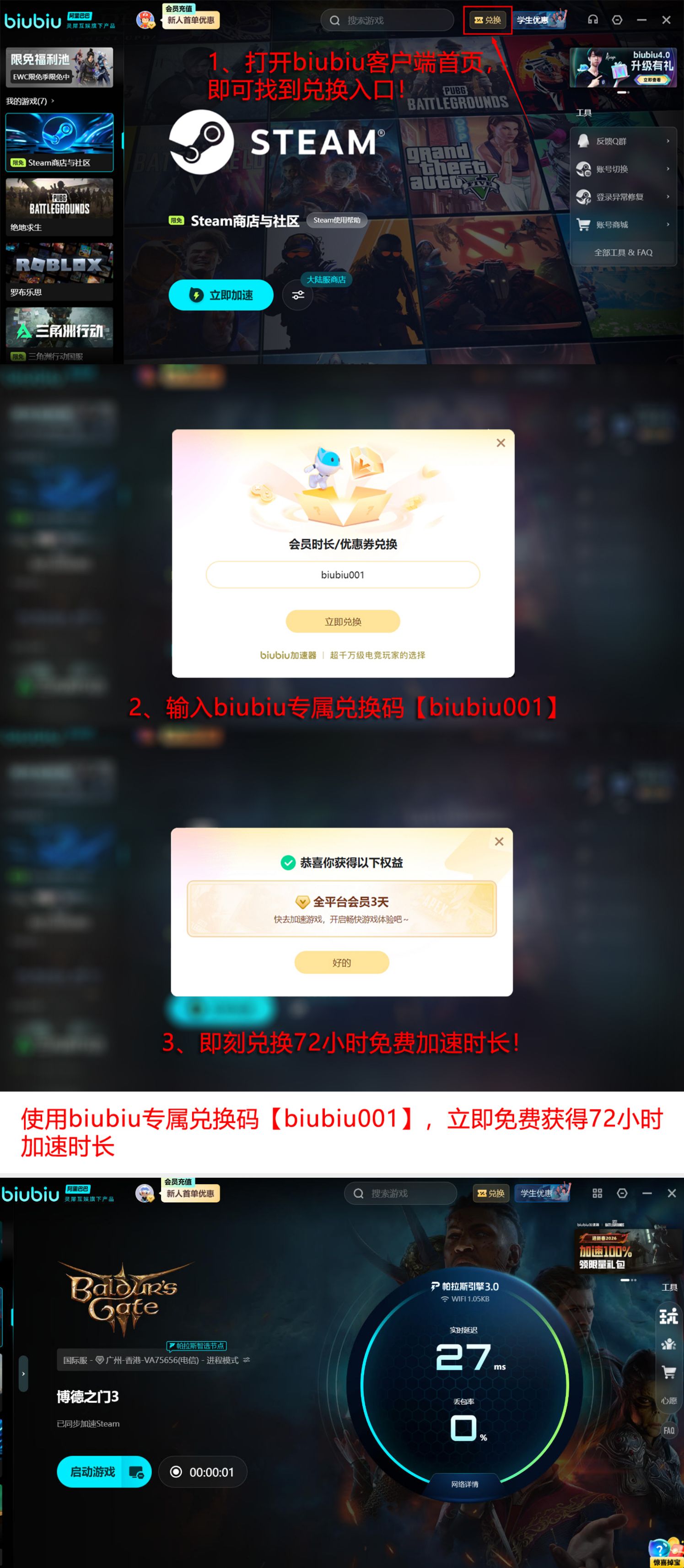 现面向全体用户开放限时福利:新注册用户完成安装后即可获赠24小时全功能免费加速时长;所有用户输入兑换码【biubiu001】可额外领取72小时跨平台通用加速权益,两项时长支持叠加使用,总计可达96小时无限制加速服务。