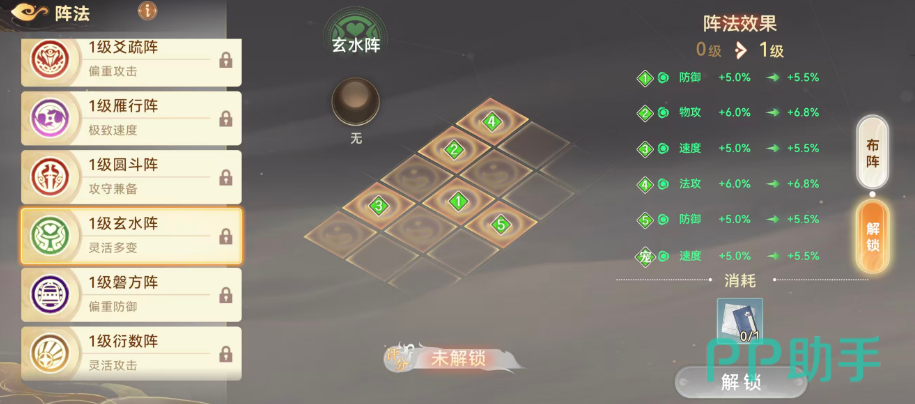 强调战术灵活性的阵容,则适合“玄水阵”。该阵法独设一突袭位,指定角色获得5%速度加成,常用于快速切入或控制打断;辅助角色被置于边缘位,法术攻击提升显著;前排角色物攻+6%,主角防御+5%。整体配置打破常规站位思维,赋予队伍更强的应变能力与多线操作空间。
