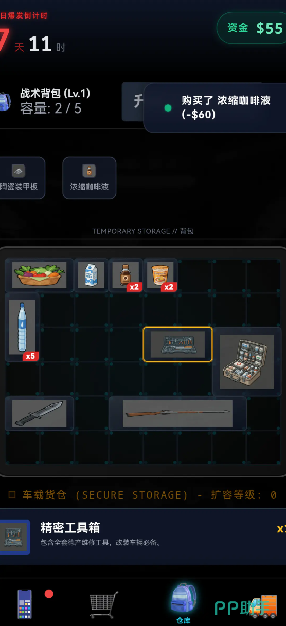 游戏核心机制围绕“7日倒计时”展开。玩家需在有限时间内完成三项关键动作:第一,快速积累初始资金;第二,系统性囤积基础生存物资(如泡面、老干妈等高热量食品,以及发电机、汽油等能源设备);第三,对初始车辆进行多阶段改装——从密封保温层、应急供电模块到防御装甲加装,每一次升级都对应真实末日场景下的功能需求。记忆碎片收集则作为隐藏叙事线索,逐步揭示末世成因与主角重生逻辑。