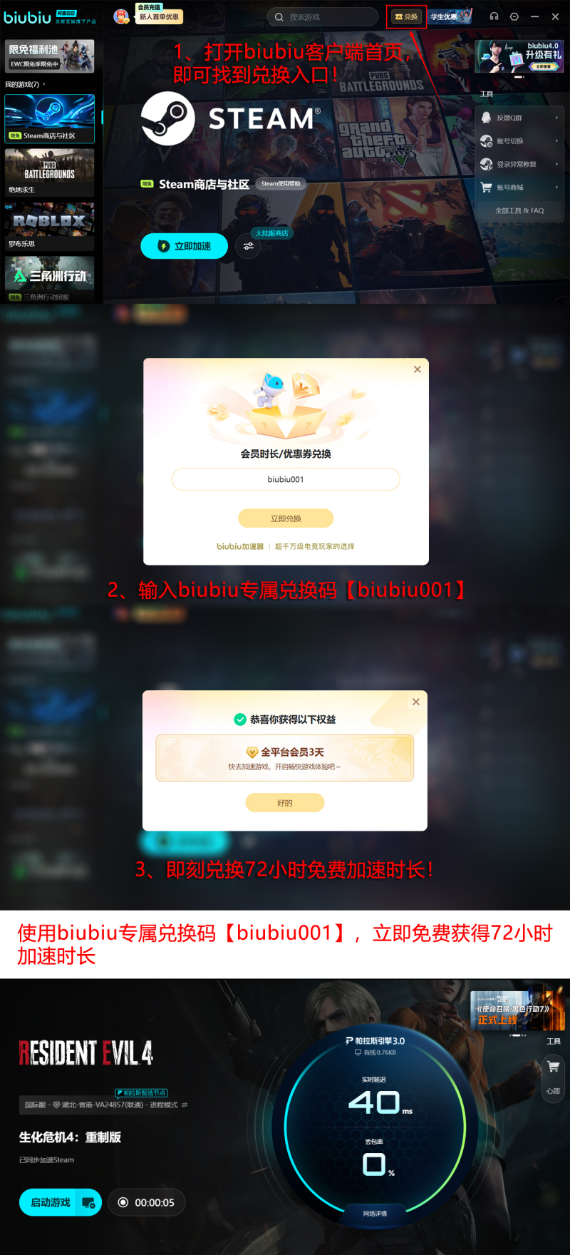 为降低新用户尝试门槛,biubiu加速器现开放专项新手权益:所有未注册账号的用户,完成手机号验证后即可领取24小时全功能免费试用时长;同时提供通用激活码biubiu001,新老用户均可兑换3天高级服务,叠加首赠总计达96小时连续使用权限。