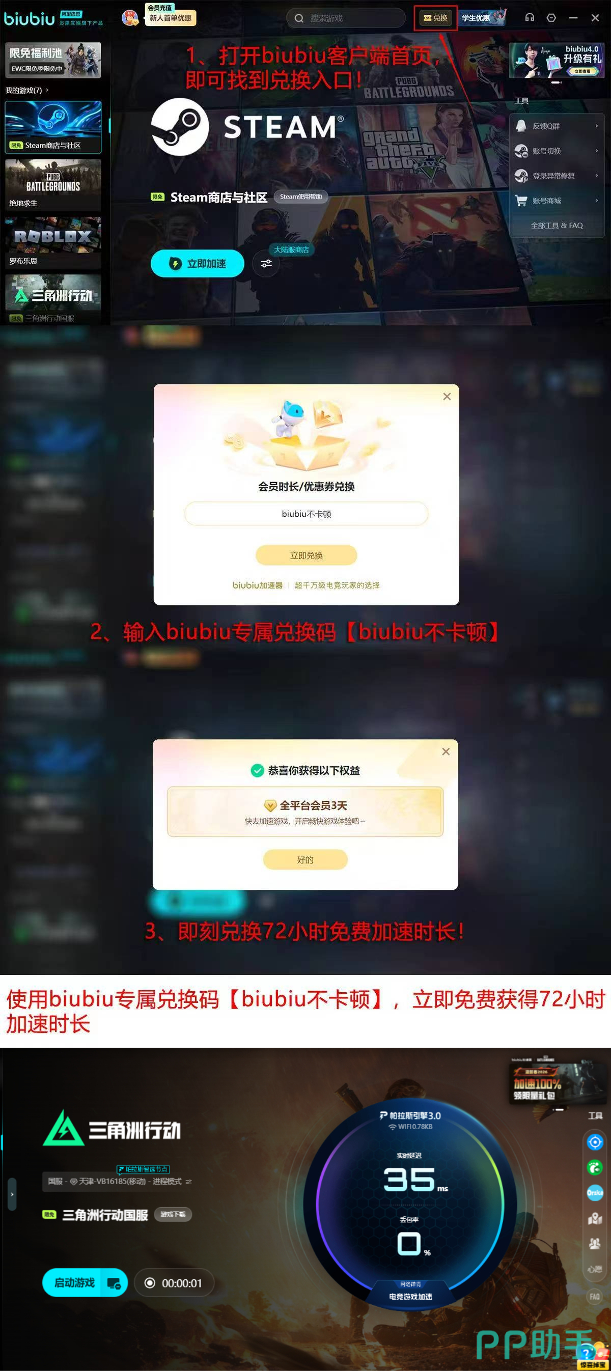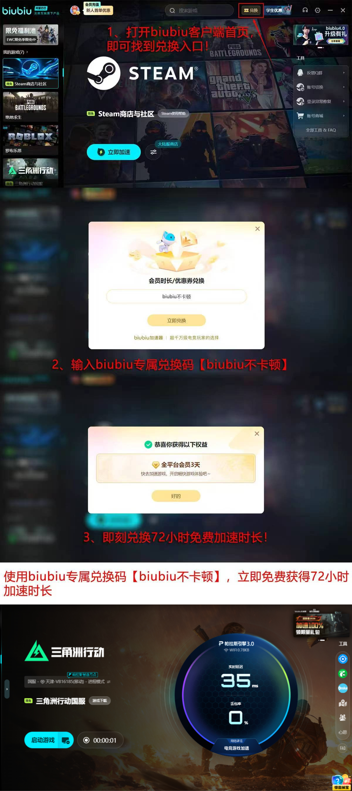 为助力新用户快速进入稳定对战状态,biubiu加速器推出专属新手权益:完成注册后,新用户即可解锁首日24小时全功能免费试用权限;所有用户(含新老)在兑换界面输入口令【biubiu不卡顿】,还可额外领取72小时加速时长,总计最高可享96小时高品质加速服务。