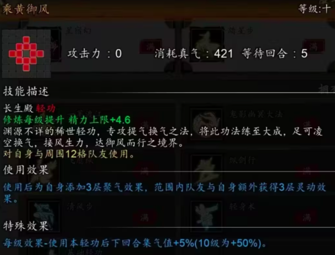 长生殿秘传「乘黄御风」定位为团队协同型轻功。释放后自身立即获得三层「聚气」,机动速度提升约5%,两回合内最高可叠加至九层;同时为自身及邻近两格范围内的友方单位附加三层「灵动」,全面提升队伍整体行动节奏。其被动「风锁长江」具备双重压制效果:降低范围内敌人移动速度,并使其集气速率下降约10%,有效延缓敌方关键技能循环。四类轻功各具策略维度,玩家应依据职业定位、队伍配置及实战需求进行针对性选择。