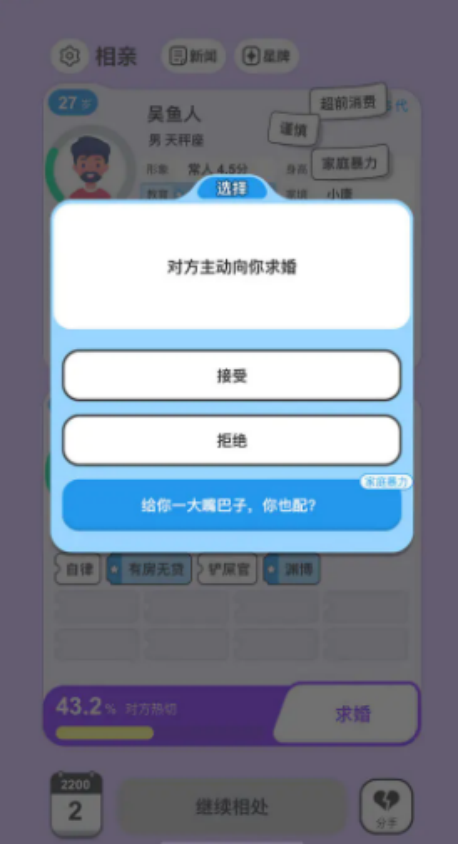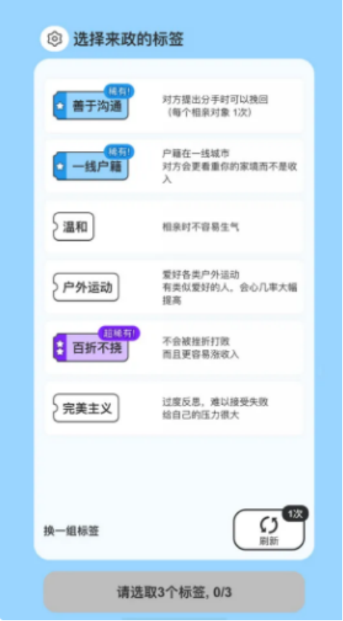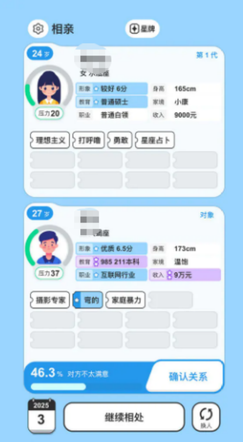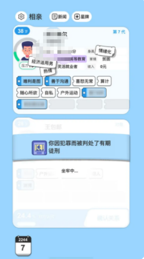 游戏采用三段式成长框架:初识阶段侧重人物标签组合与初始人设塑造;交往阶段引入多重随机事件与对话选项,影响好感度、压力值及社会评价;终局阶段则延伸至家庭组建与代际传承,支持跨代操控与繁衍系统。每位角色的头像、性格倾向、职业背景均具备程序化生成逻辑,确保每次开局体验差异显著。此外,内置“时代新闻播报”模块,会随游戏进程动态穿插诸如“AI婚介普及”“跨星系联谊政策试行”等虚构但具现实投射的时事条目,玩家的关键抉择将直接影响角色心理健康与人生结局走向——错误决策可能导致压力爆表、社交崩坏,最终触发“终身未嫁/未娶”结局。