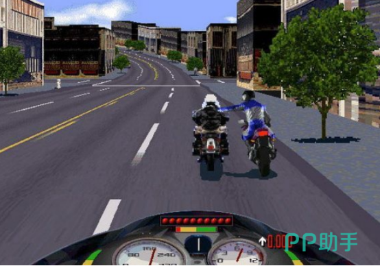 2008年同步推出移动版本,以3D建模呈现摩托车外观差异与赛道动态光影,共收录12款可切换载具,每辆具备独立加速度、最高速度与耐久值参数;赛道设计包含城市街道、山地弯道与工业区三类场景;对抗机制支持近身撞击、道具投掷及路线拦截,强调实时反应与路径预判能力,是当年罕见的强对抗性动作竞速手游。