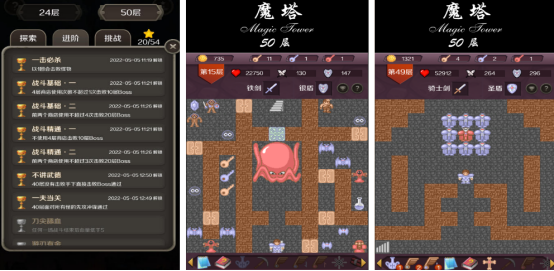 本作整合《魔塔24层》与《魔塔50层》双版本内容,采用像素风美术风格,角色属性含HP、MP、攻击、防御四大基础数值,怪物配置遵循固定公式生成;玩家需通过楼层间资源分配、技能释放时机与敌人行动规律推演完成通关,属于国内最早一批将Roguelike元素融入回合制爬塔结构的手游实践案例。