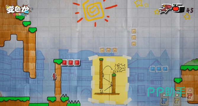 采用涂鸦手绘的画面风格,里面有一只变色龙在不同的场景里活动,它可以根据周围的环境改变自身颜色,和场景融为一体。游戏里的场景大多是平面样式,有的像绘本,有的像黑板,每个赛道里都有不一样的障碍,玩家需要帮助变色龙避开这些障碍,顺利走到终点。变色龙可以在三种颜色之间自由切换,用来适应不同环境,同时还能做出冲刺和跳跃等多种动作。