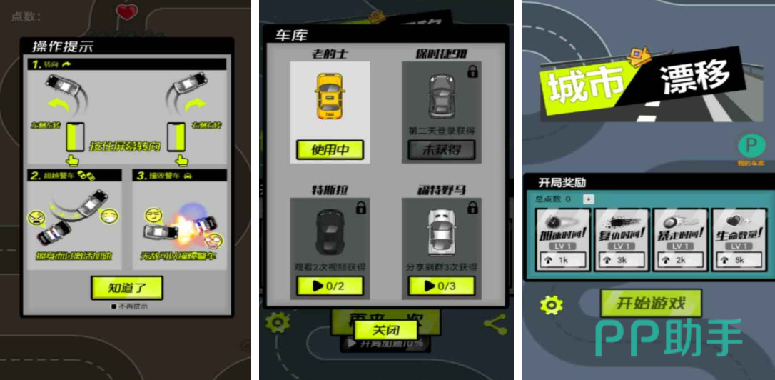 采用俯视视角呈现城市街景,画面精致且具备昼夜交替系统。操作逻辑简洁,单手即可完成全部指令,适合碎片化游玩。漂移轨迹带有明显烟尘拖尾与光效反馈,视觉辨识度强。内置计时挑战、连击评分、障碍规避等多种玩法模式。