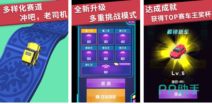 极简交互设计,仅需点击/长按屏幕控制刹车与漂移时机,强调节奏感与预判精度。上帝视角便于观察整体走线,适合新手快速建立空间认知。关卡结构紧凑,单局时长约60秒,配合震动反馈与音效提示,营造高强度竞技氛围。