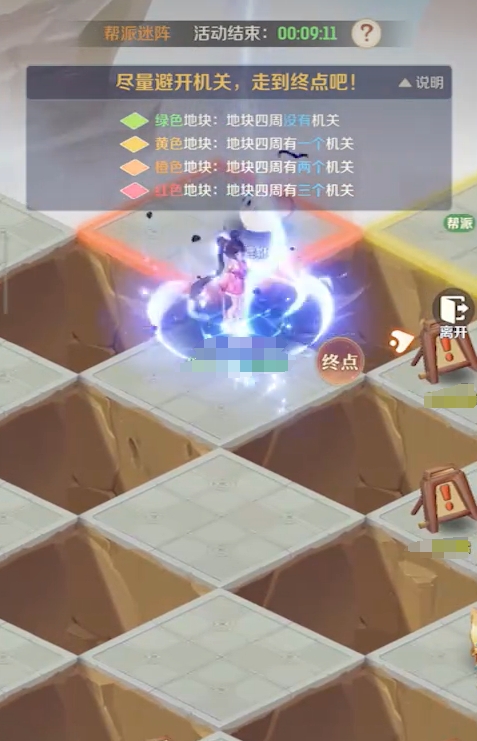 帮派迷阵为周期性开放玩法,固定于每周一、三、五、日的12:00与18:00准时开启。其底层逻辑借鉴经典扫雷规则,地图由若干网格构成,玩家需依据格子颜色提示,推断相邻区域是否存在陷阱,从而规划唯一安全路径抵达终点。具体判定标准如下:绿色格子表示其上下左右四个邻格全部无机关;黄色格子代表四邻中恰有1个存在陷阱;橙色格子对应2个陷阱;红色格子则表明四邻中有3处埋设机关。需特别注意——每个格子仅与正交方向的四个格子相邻,因此当踩中红色格子时,应立即折返,避免继续前行触发惩罚机制。