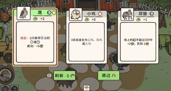 玩法围绕动物特性展开:野猪触发“感染”效果,母鸡稳定产出金币,构成新手推荐的养猪过渡流;灰狼捕食山羊实现快速升级,老虎作为中期核心输出,构成高爆发的灰狼捕食流。不同流派需匹配对应地形——鸟类依赖巢穴、爬行类适配沙地,地形选择直接影响资源收益倍率。