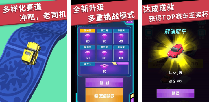 采用全3D建模与动态光影渲染,UI界面立体感强,菜单交互流畅自然。赛道结构突破平面限制,含多层立交、螺旋坡道、空中跳台等复合地形,极大拓展走线可能性。成就系统嵌套隐藏条件与限时挑战,鼓励反复尝试;任务目标涵盖速度、连击、特技等维度,玩法维度全面且富有延展性。