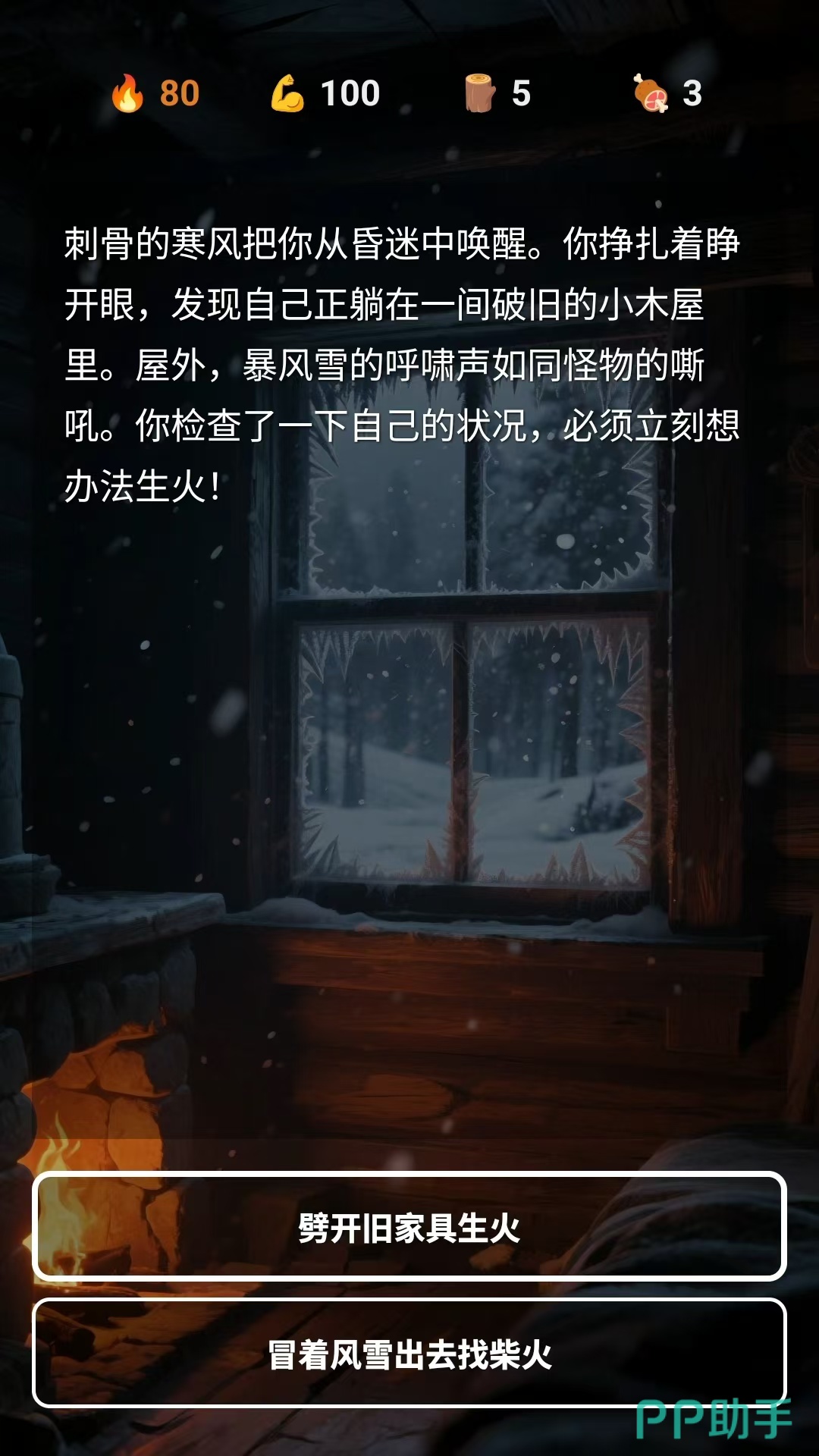一款高沉浸感的文字生存冒险游戏。玩家被困于雪山木屋,需在七日内维持体温、体力与物资储备等待救援。每日面临多重抉择:是否外出砍柴加固房屋?饥饿时是否消耗食物保体温?不同选择实时影响三项核心数值,微小偏差可能引发连锁危机。七天时间虽短,却因决策权重高而充满张力,考验资源管理与风险预判能力。
