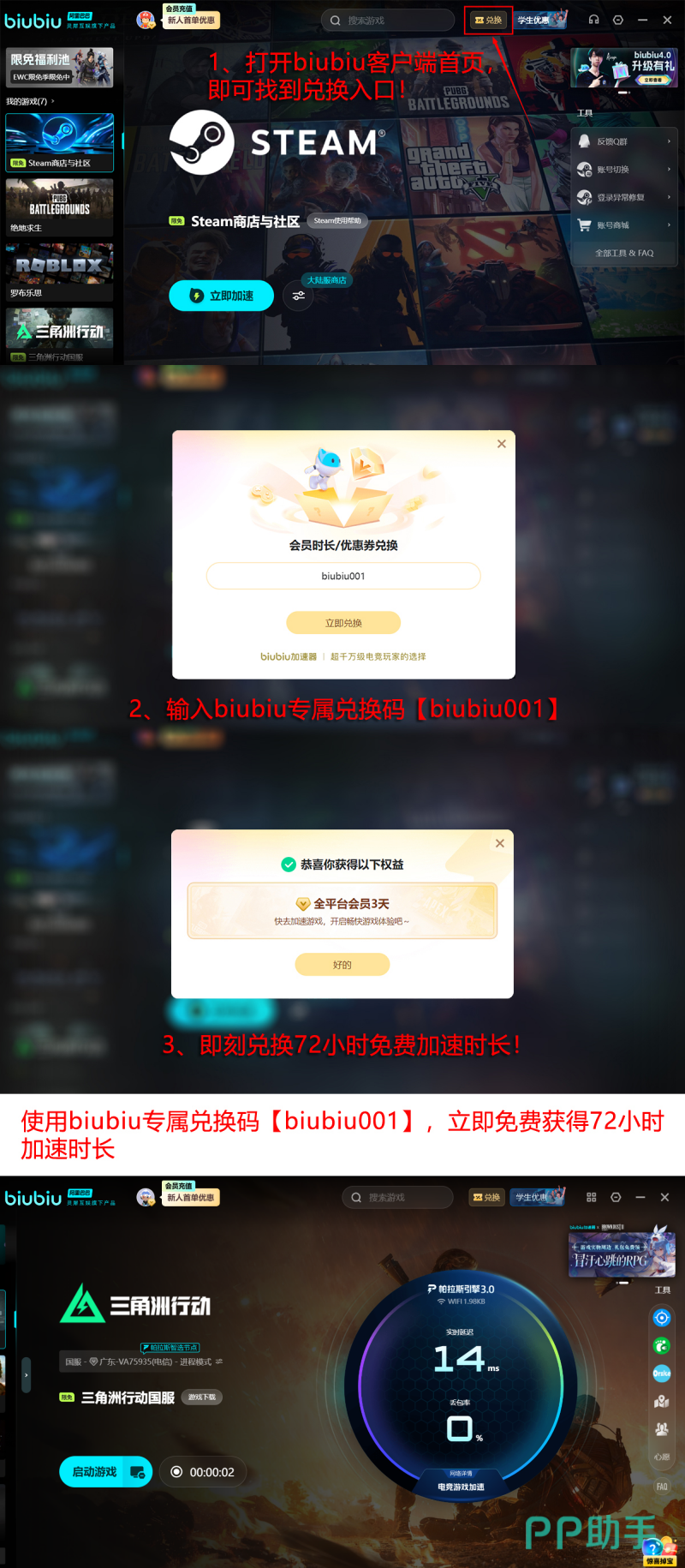 当前biubiu加速器面向用户推出多项限时福利:所有用户输入兑换码biubiu001,即可领取三天免费加速时长;新用户完成注册后自动获赠24小时体验资格;两项权益叠加使用,最高可享96小时无门槛加速服务,真正实现零成本畅玩。