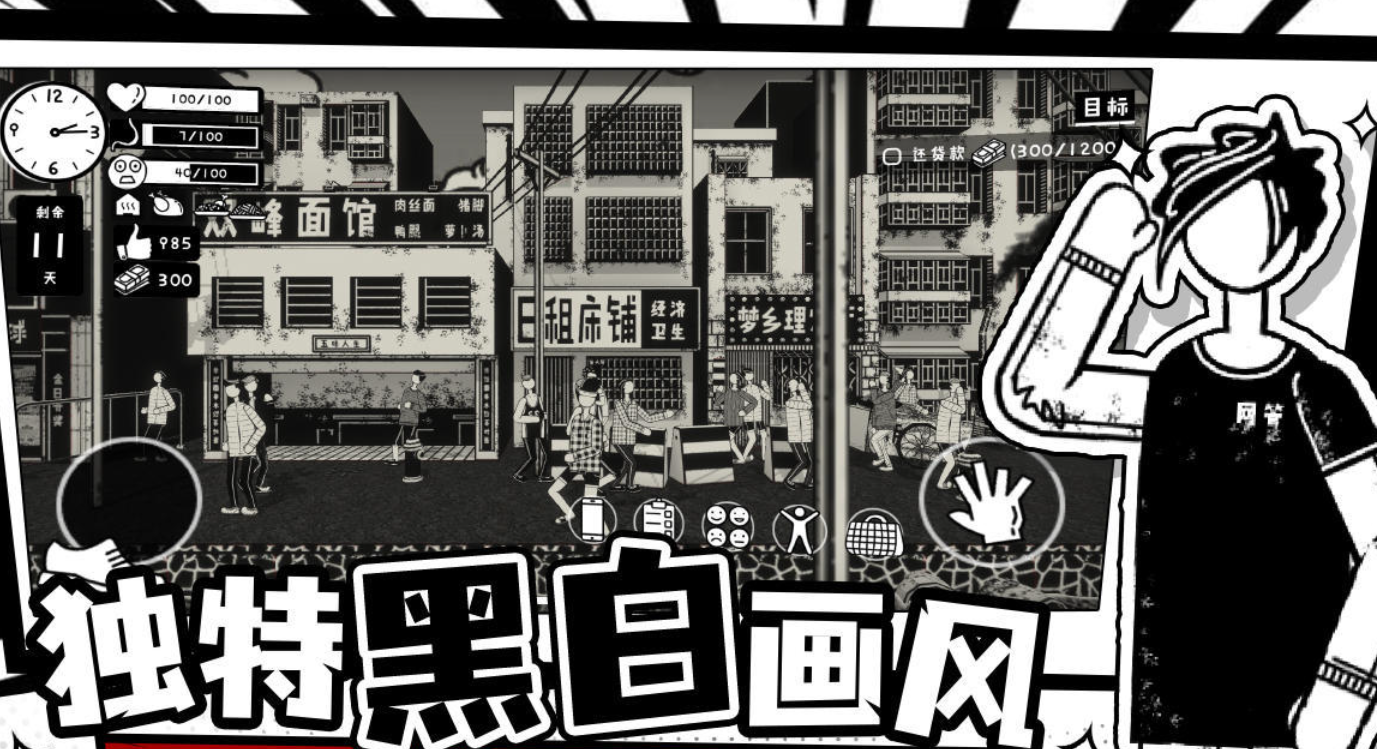 黑白漫画风格人生模拟游戏,采用阶段式成长模型:初期聚焦薪资积累与技能学习,中期转向投资理财与副业拓展,后期开放创业孵化与资产配置。社会规则以数据可视化方式呈现,包括通货膨胀率、行业景气指数、政策变动阈值等隐性变量,增强现实映射深度与决策复杂度。