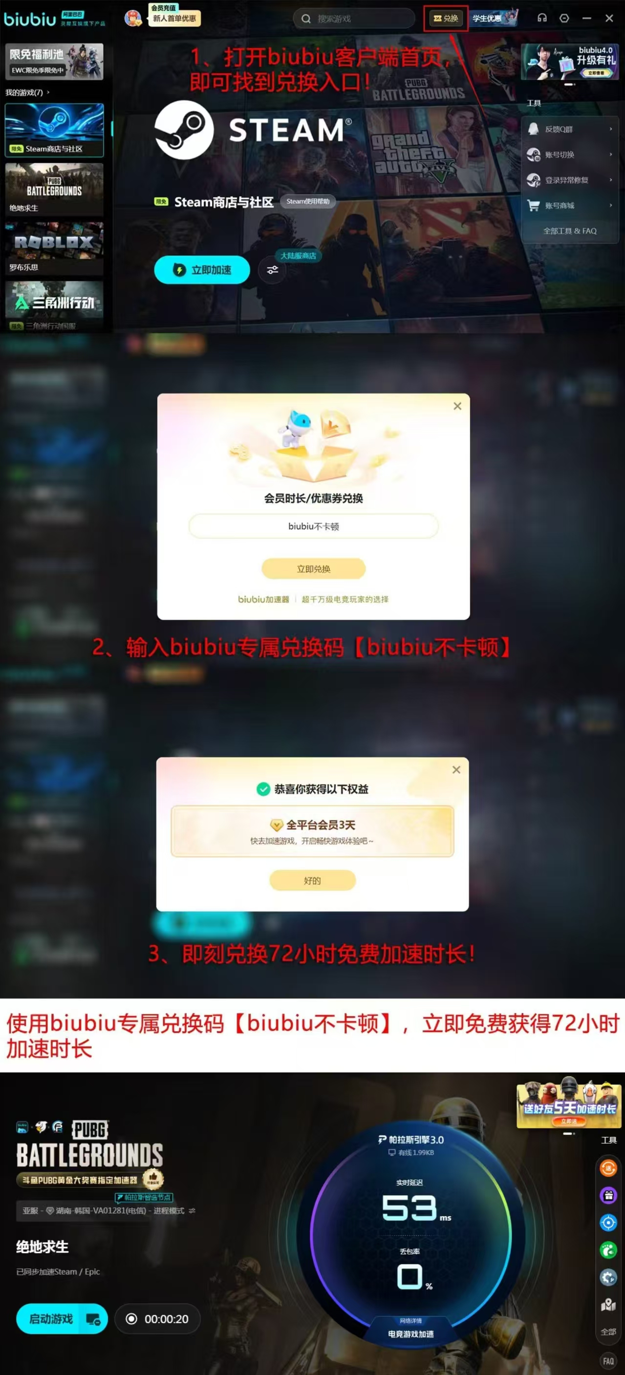 当前正值平台运营活动期,新用户注册即赠24小时全节点加速权限;所有用户输入兑换码【biubiu不卡顿】,均可额外领取3日加速时长。综合计算,首次使用者可在连续4日内无障碍体验高稳定性联机环境。理论分析不如实测反馈,建议遇到频繁崩溃问题的玩家优先启用该方案进行交叉验证。