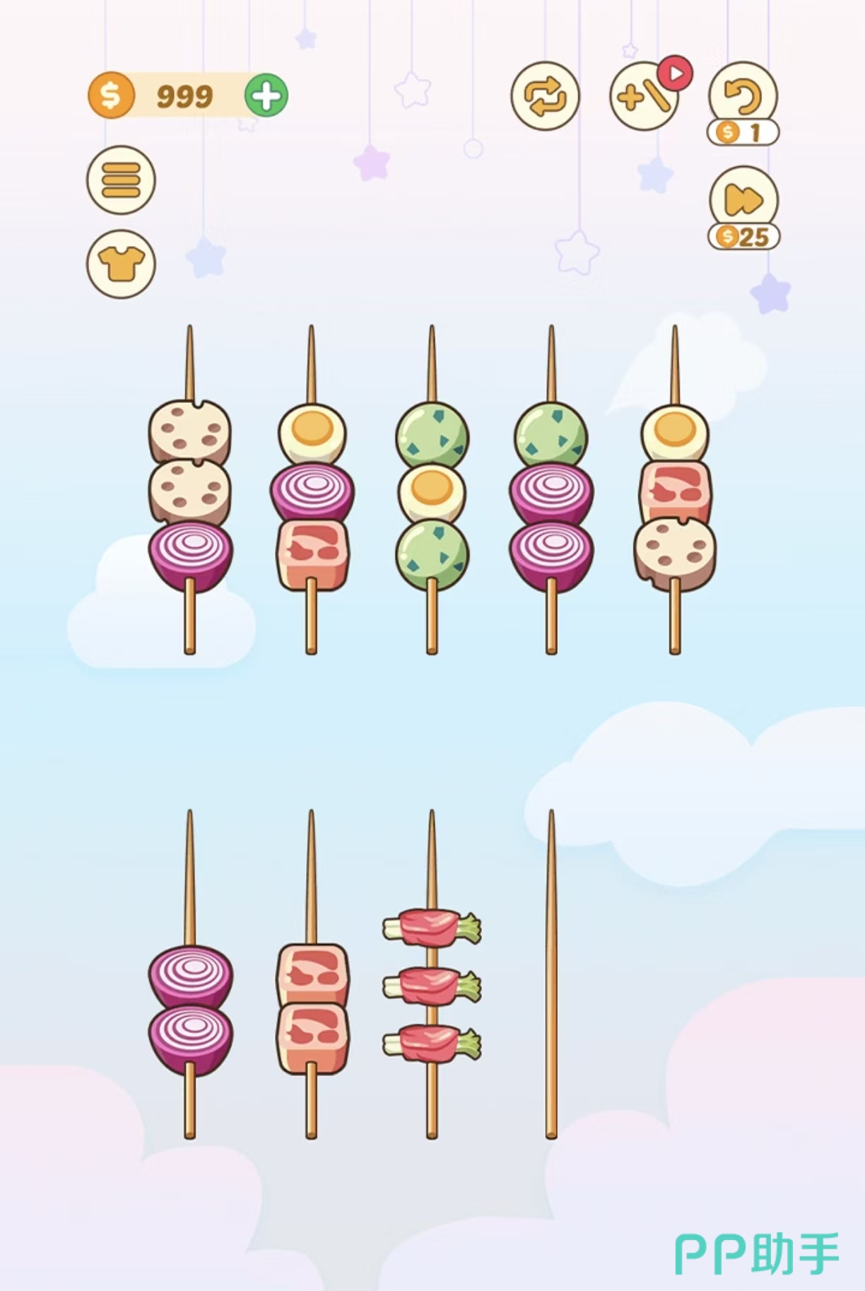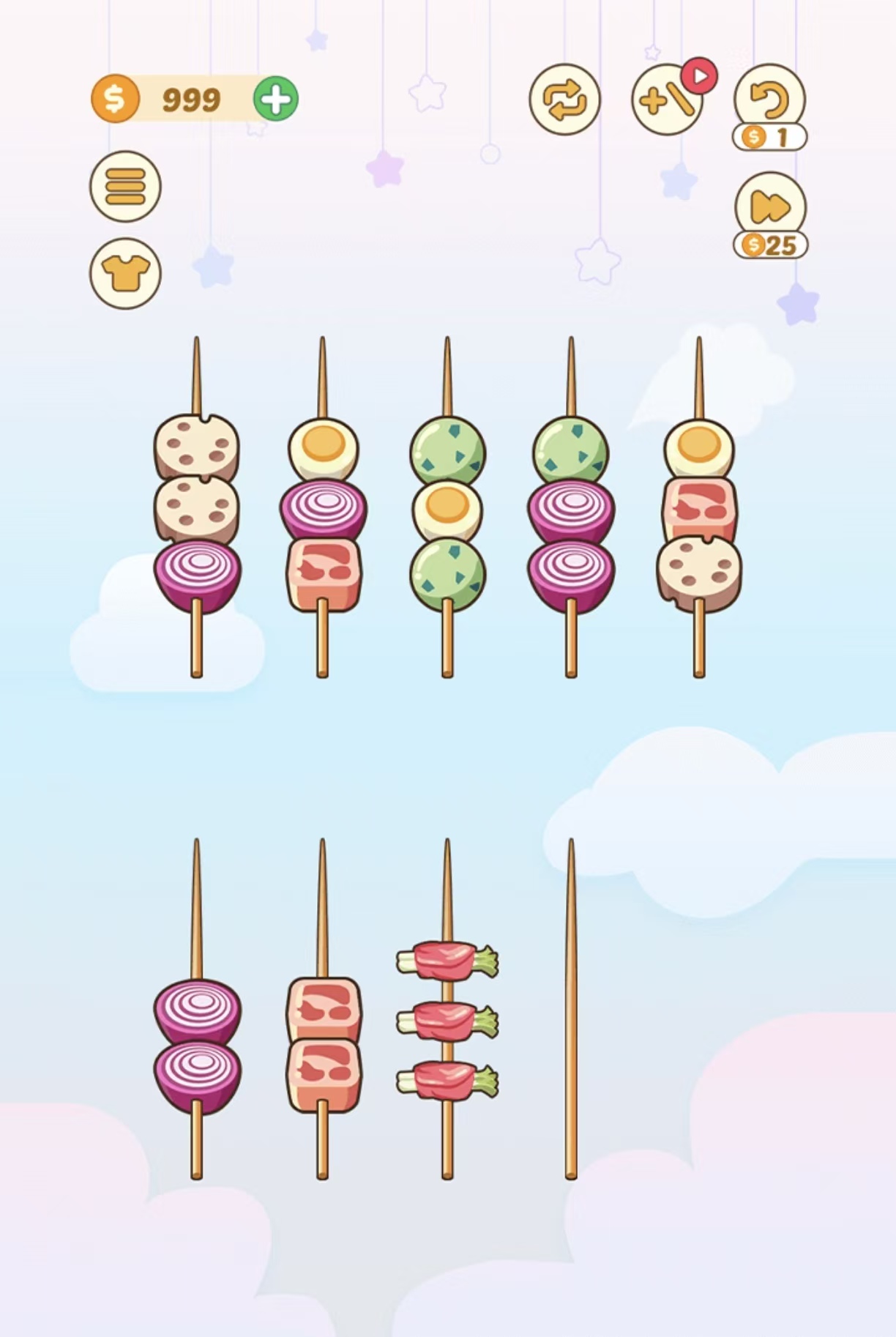 游戏以烧烤竹签为载体,要求玩家按颜色、形状、类别对食材进行序列化归类。初期关卡限定3种食材,随进度递增至7类复合识别目标。操作需兼顾横向分类逻辑与纵向堆叠稳定性,强化视觉辨别力与手部控制精度。通关奖励金币可用于解锁28款竹签外观及辅助道具,经济系统设计符合儿童延迟满足能力发展阶段特征。