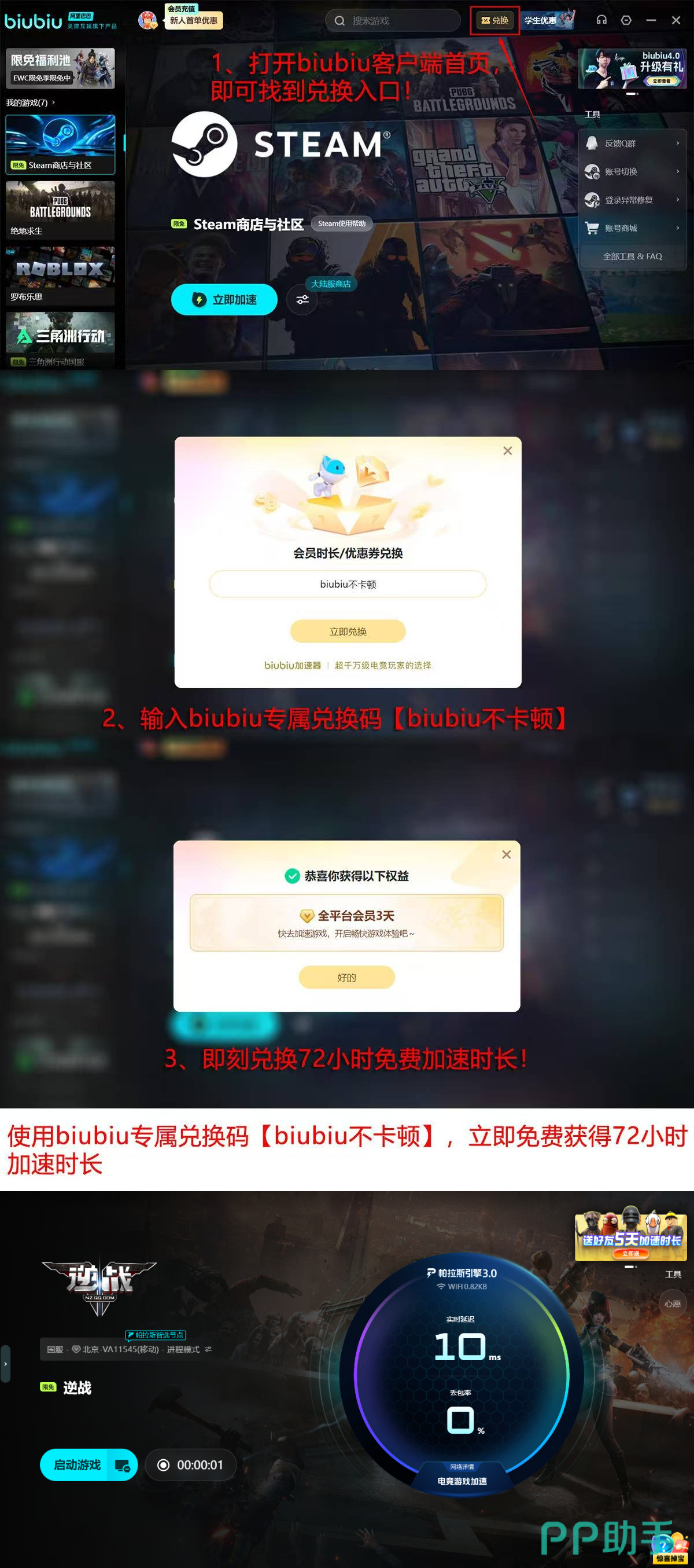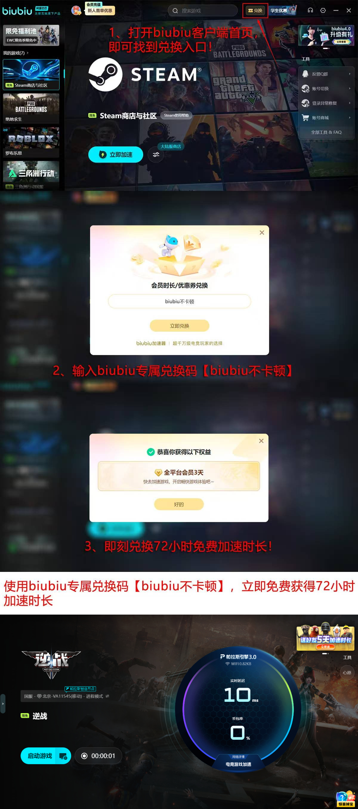 新用户完成注册后,即可立即启用24小时全功能免费试用权限;输入专属口令【biubiu不卡顿】,额外获赠72小时加速时长;两项叠加总计可享96小时无限制加速服务。该福利面向所有初次接触逆战的新手玩家开放,无需绑定支付方式,即可零成本体验专业级网络优化效果,切实规避连接超时风险。