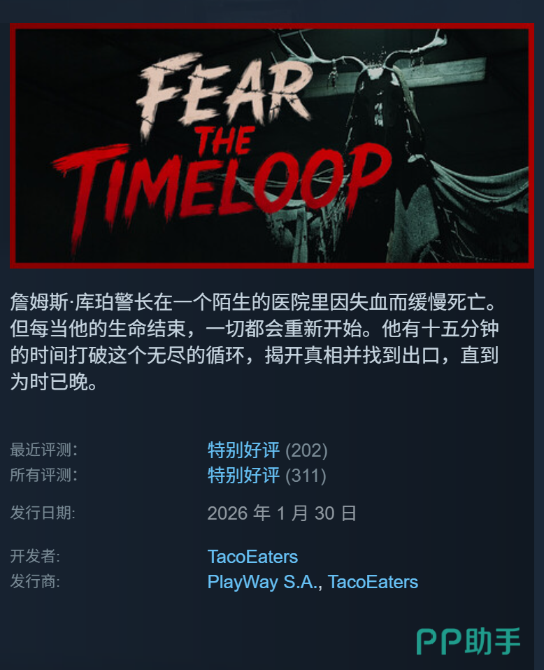 《Fear the Timeloop》是一款融合生存恐怖、动作冒险与时间循环机制的原创单机游戏。玩家将被困在一场无法逃脱的诡异时空闭环中,在重复却不断异变的环境中求生——每一次重启,场景细节、敌人行为与危机触发点都会发生微妙偏移,带来持续升级的心理压迫与操作挑战。本作已于2026年1月30日登陆Steam平台,同步发售官方原声音乐专辑,以沉浸式音效设计强化循环叙事的窒息感与宿命张力。