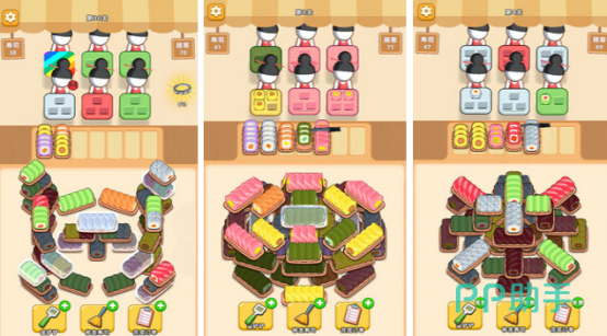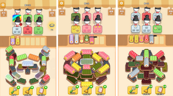 以日式寿司为题材的消除向单机游戏。画面呈现多种造型与配色的寿司单元,玩家通过点击将相同品类聚拢拼合,达成完整拼盘即可消除。通关条件明确:清空关卡内所有数字标识方块。辅以磁铁、重排等道具系统,优化操作容错率,提升闯关流畅度。