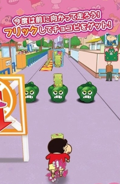 这是一款强调节奏感与操作反馈的横向卷轴跑酷游戏。画面采用低多边形建模配合手绘质感UI,高度复刻动画片的视觉语言。玩家需在高速移动中完成跳跃、滑铲、闪避等动作组合,同时收集春日部特产道具并触发剧情彩蛋。关卡设计融入大量原作桥段,如百货商场追逐战、动感超人主题赛道等。