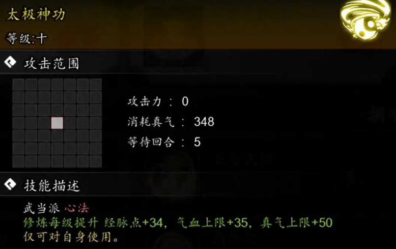云相太极的获取门槛为本门武学中太极拳与太极剑均达到10级。生效后可移除三个负面状态,并赋予两层“归元”效果。归元效果在单场战斗结束时结算,对全体敌方单位造成等同于角色攻击力120%的额外伤害,属于典型的收尾增伤型心法。