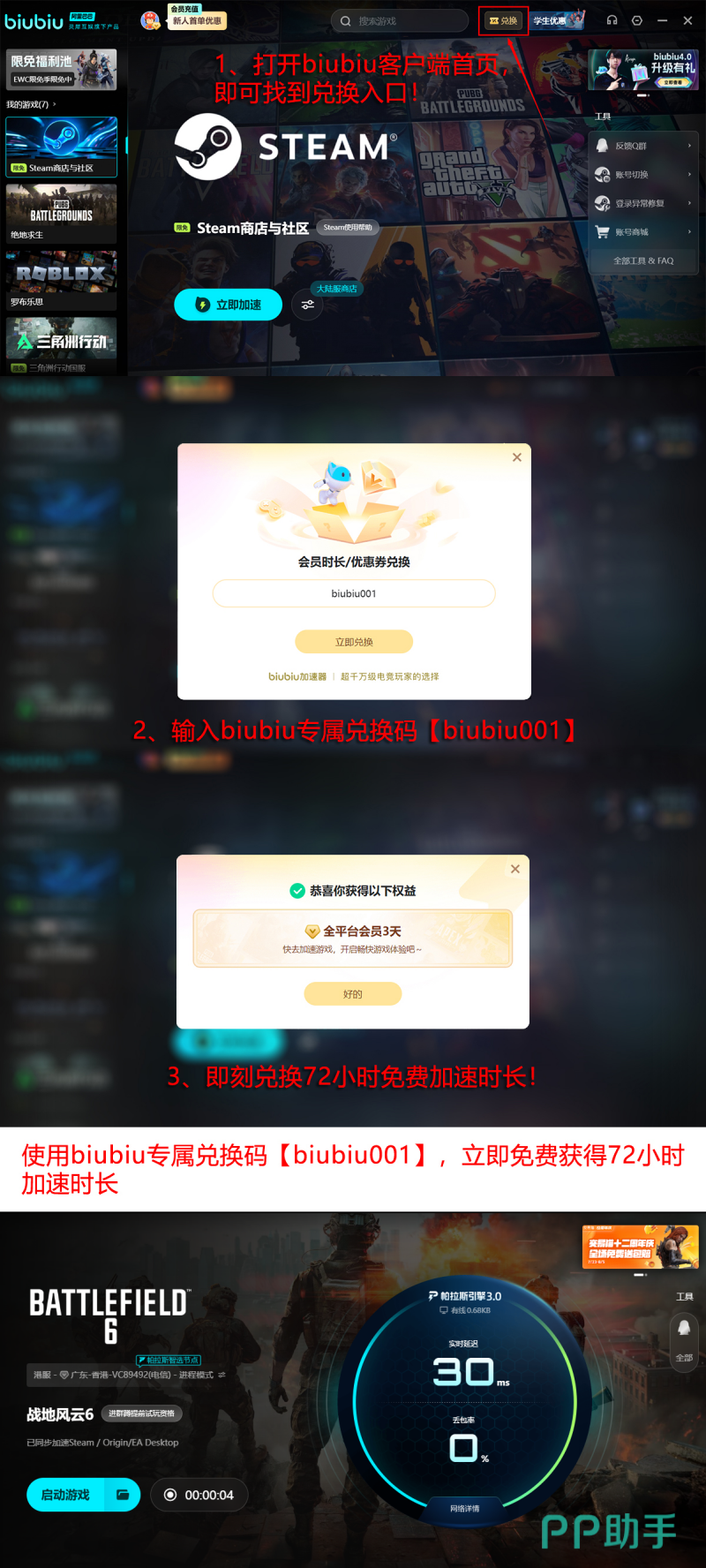 目前,biubiu加速器已正式成为职业电竞战队pero指定合作加速平台,其技术可靠性与服务稳定性获得专业级验证。新用户注册后可立即领取24小时全功能免费试用权益;老用户输入兑换码【biubiu001】,即可在客户端首页兑换3天连续加速服务,累计享96小时免付费使用时长。