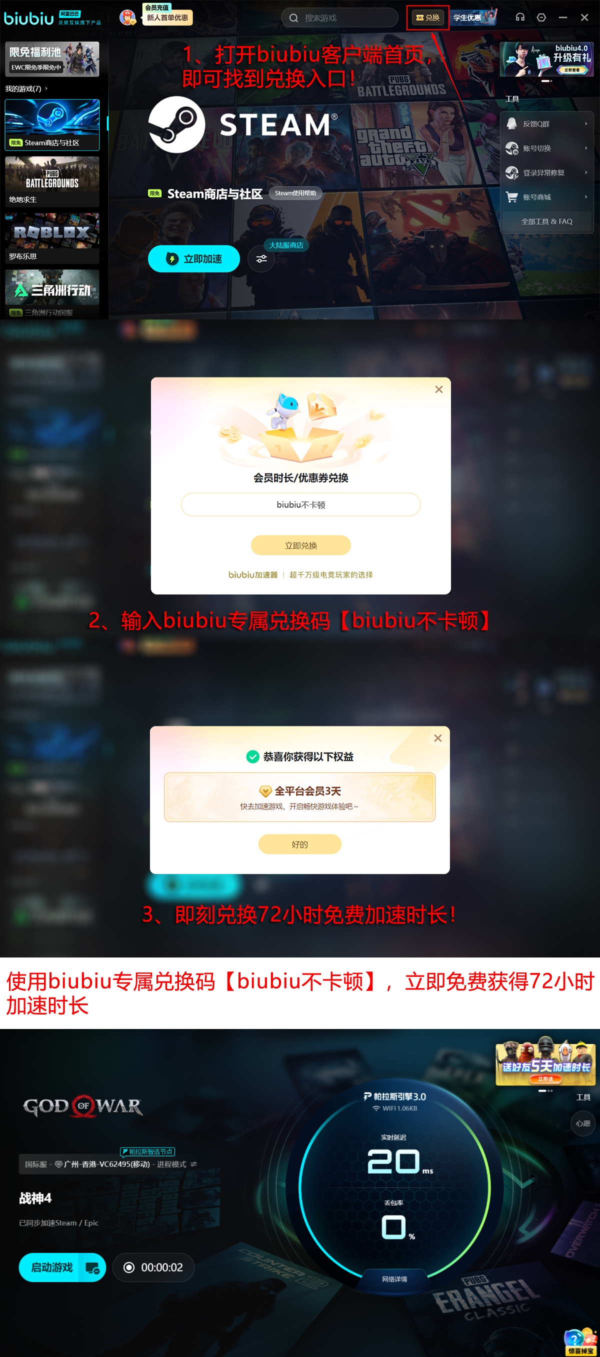 新用户可享双重福利:注册即赠24小时全游戏加速时长;前往兑换中心输入口令【biubiu不卡顿】,额外领取3天有效期加速权益。两项叠加后,最高可获得总计96小时无限制加速服务,充分满足《战神4》全流程通关及多周目探索需求,确保每一场奎托斯的怒吼都稳定输出。