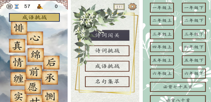 紧扣教育部《义务教育语文课程标准》古诗文背诵推荐篇目开发,涵盖75首小学必背古诗词。通过诗句匹配、意境填空、作者年代排序等轻量互动形式,将文学常识转化为可操作任务。每首诗附带音频朗读、白话译文与创作背景简析,提升理解深度与审美感知力。
