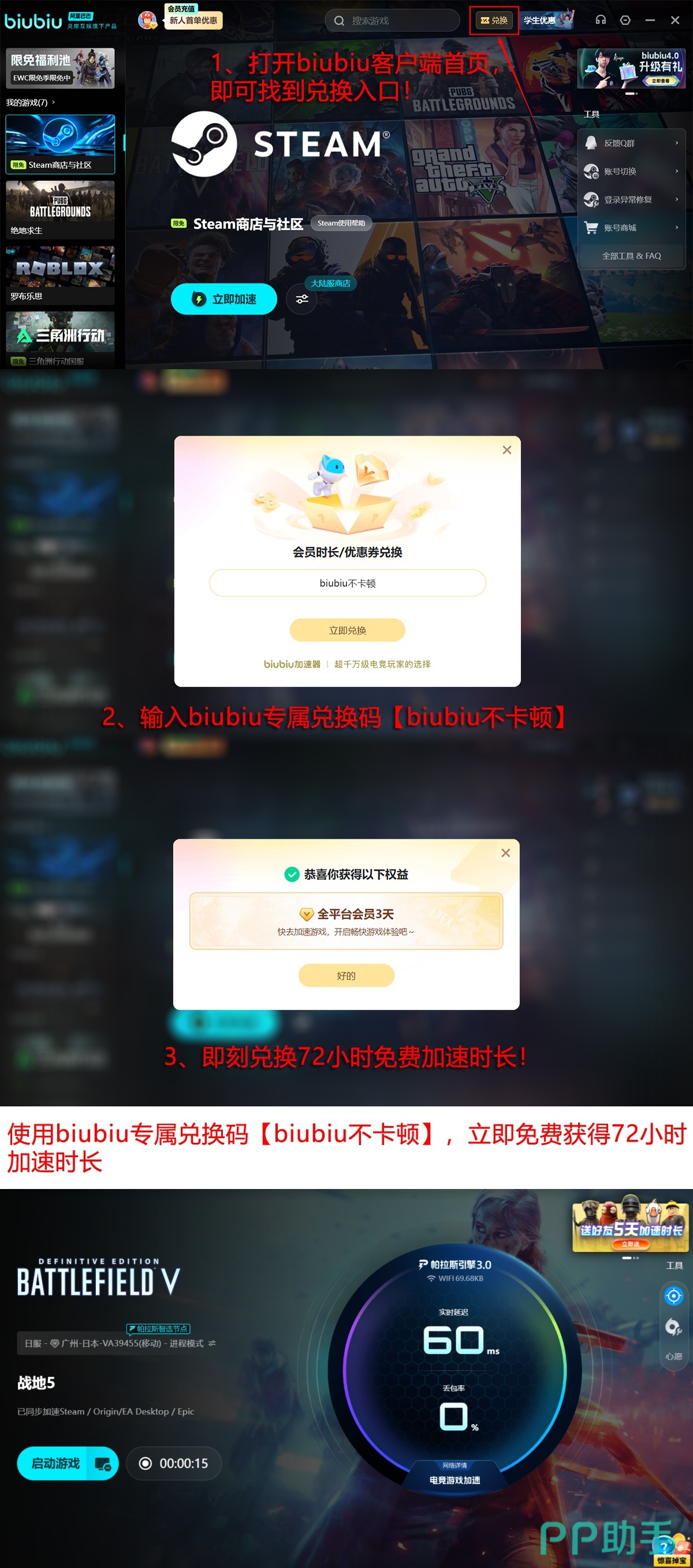 首次使用的用户可注册新账号,立即获得24小时免费加速时长,直观体验网络稳定性提升带来的操作响应优化。若确认服务效果,可在客户端首页“兑换中心”输入专属口令【biubiu不卡顿】,额外领取3天连续加速权益。新用户综合福利达96小时,足以支撑完整的游戏安装、配置调试及多场诺曼底战役实战测试,充分对比加速前后的联机表现差异。