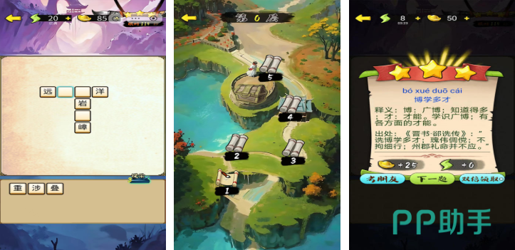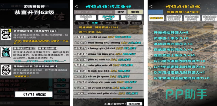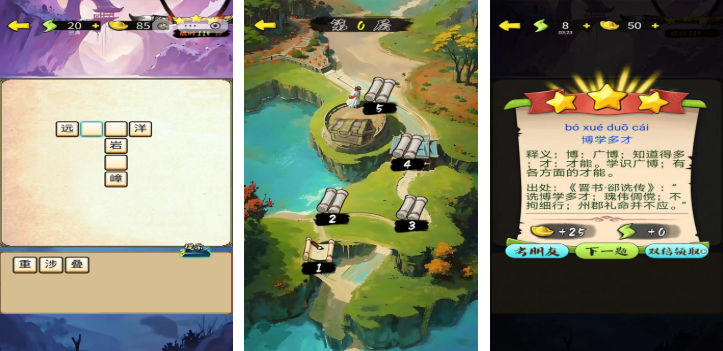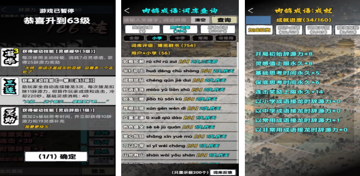 将Roguelike机制深度融入成语学习场景:每次开局随机生成词库权重、关卡事件与技能加成,确保重复游玩不重样。古风水墨界面配合实时语音朗读,增强沉浸感。失败后可回溯关键成语解析,避免挫败感,兼顾娱乐性与知识沉淀效率。