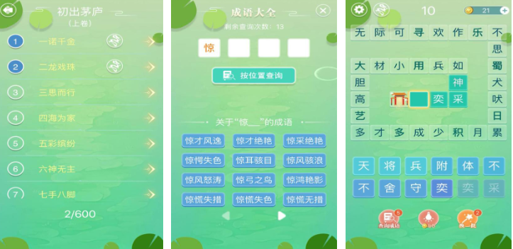本作延续传统接龙机制,操作简洁直观,支持点触式汉字补全,关卡设计由浅入深,覆盖常用成语超两千条。界面采用淡雅配色与手绘风格元素,视觉清爽无干扰,适配各年龄段用户。每关完成后可查看成语出处与释义,实现“玩中学、学中记”的闭环学习路径。