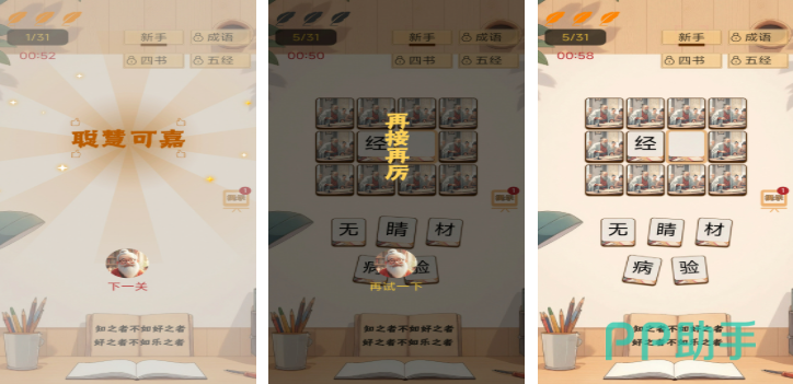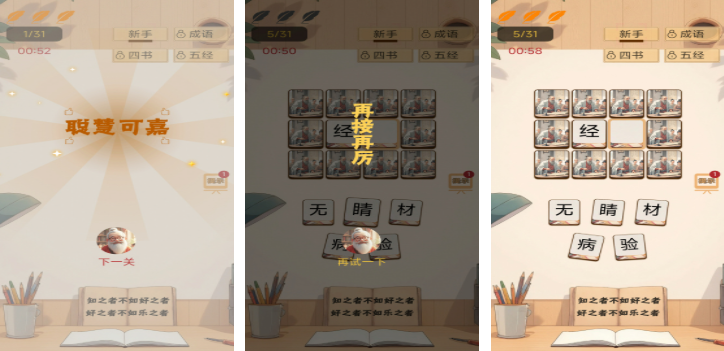 融合轻度解谜与知识拓展,每关通关后自动解锁对应成语的典故来源、近义辨析及现代用法示例。交互采用拖拽+点击双模操作,响应灵敏;无强制广告与内购门槛,全程免费使用核心功能。特别设置“易错高频词”专题关卡,针对性强化易混淆成语辨析能力。