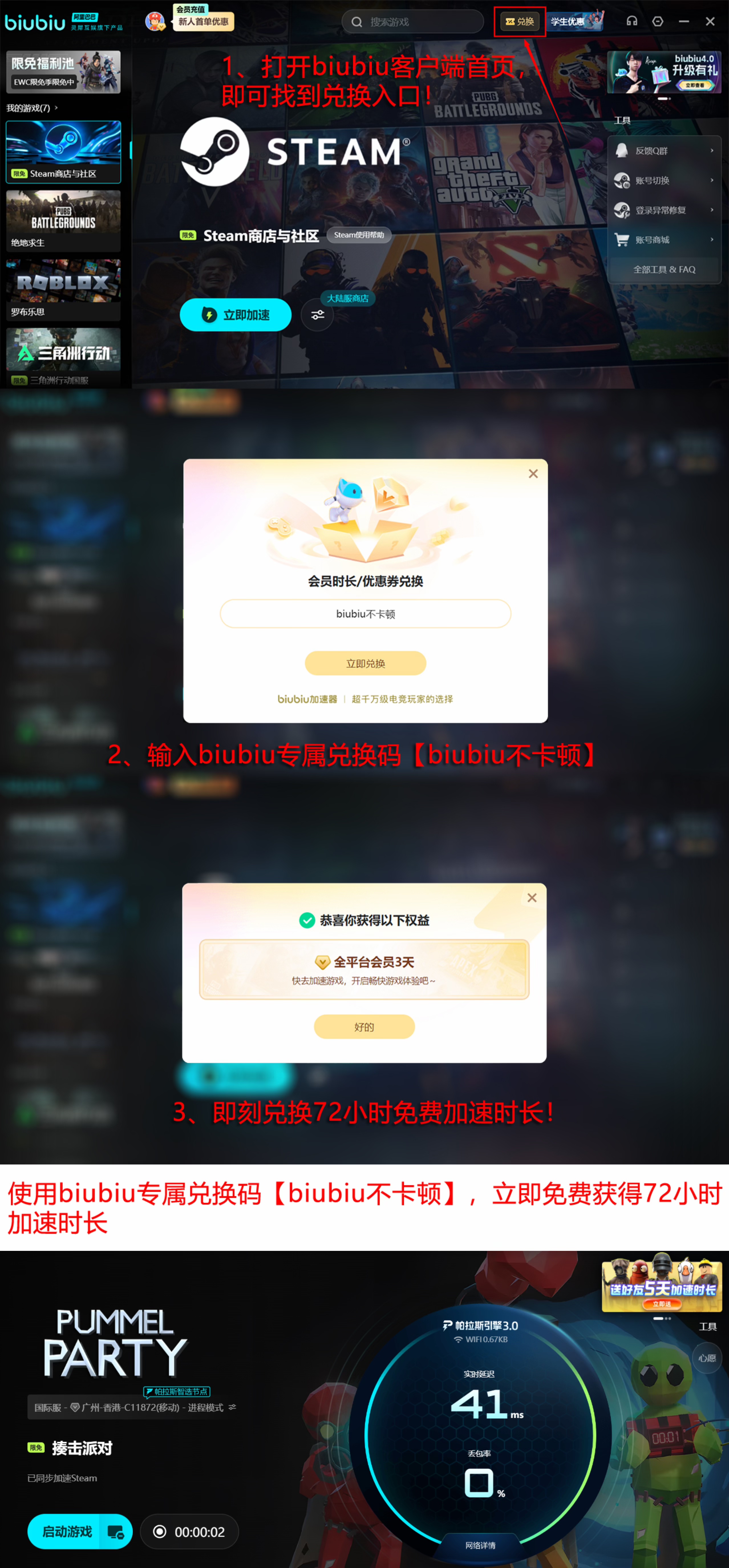 除技术能力外,biubiu加速器亦提供实用型用户权益:新注册用户可立即获得24小时专属加速时长;所有历史用户(无论注册时长),均可通过输入口令【biubiu不卡顿】免费领取3天全量加速权限,覆盖《揍击派对》全部服务器节点。