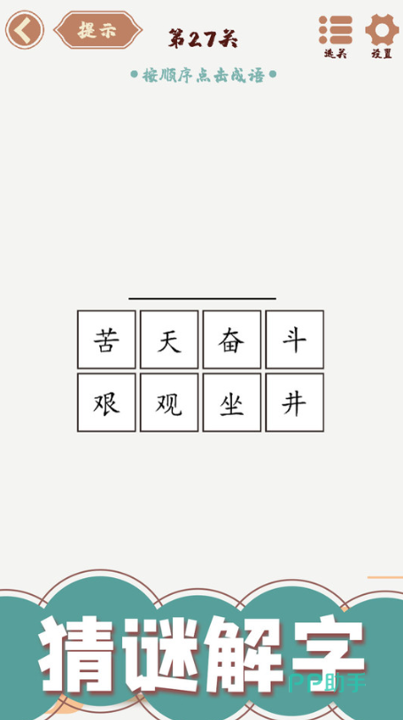 游戏内置智能辅助系统,包含提示功能、笔顺回放和错字解析等实用工具,帮助玩家在卡关时快速定位思路。所有汉字均在标准田字格中动态呈现,同步标注笔画顺序,强化书写规范意识。配合轻柔背景音效与简洁UI交互,营造低压力、高专注的学习型游戏氛围。