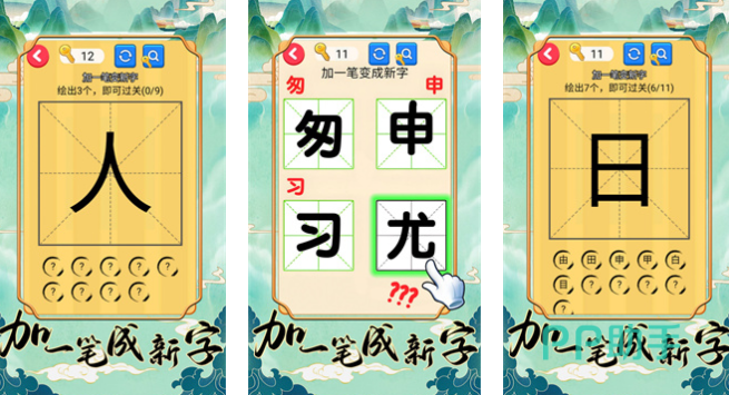 本作强调汉字基础知识的活学活用,每关呈现一个标准汉字,要求玩家严格遵循“仅加或减一笔”的规则生成新字。关卡采用渐进式难度设计:前期以高频常用字为主,如“日”“木”“口”等;后期逐步引入形近字辨析、异体字识别及古文字变形等进阶内容。通关后可获得个性化资源,用于更换游戏界面主题背景,提升视觉新鲜感与沉浸体验。