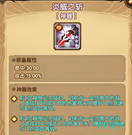 战士专属神器,装备属性带来命中和攻击力。前两次解放超必杀的时候,对前面绝对范围内的对手带来220%攻击力的伤害并永远提高15点急速与12点吸血级别。