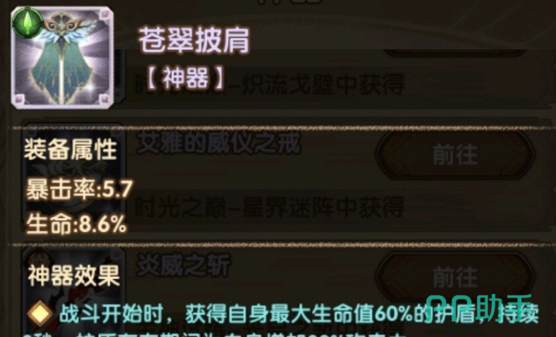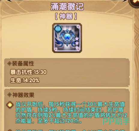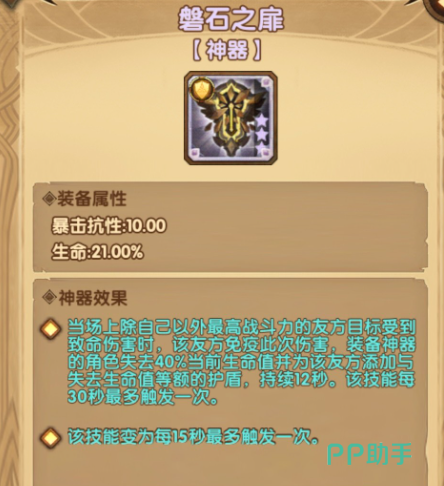 辅助神器,装备属性带来爆击抵抗和血量。作战开启后每15秒获取1个40%较大血量的防御盾,持续5秒。时长完结的时候,若防御盾仍旧存留则每2%较大血量的防御盾将转换为12点能量,最多不超出120点。