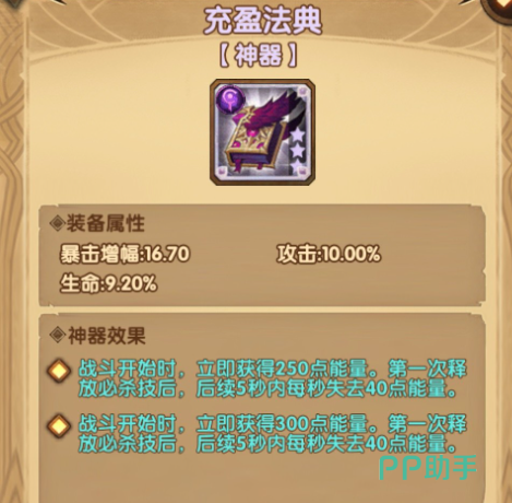 法师专属神器充盈法典,装备属性带来爆击增幅、血量、攻击力。作战开启后,当即获取300点能量。第1次解放超必杀后,后续5秒内一秒缺失40点力量。