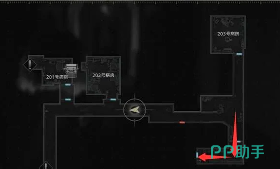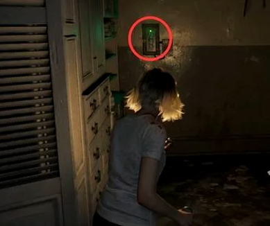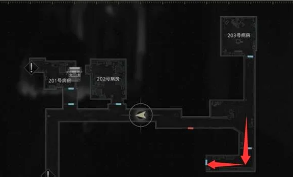 进入疗养院二层后,首要动作是点亮201与203房间的照明设备。此处设定中,光源具有驱散敌对单位的机制效果,开启灯光后对应区域即转为临时安全区。随后前往东侧红灯旁的木质长桌,拾取空玻璃瓶——此举将强制触发一段关键剧情,并招致一名巡逻型敌人现身。此时切勿正面交战,应立即撤退至已亮灯的203或201房间内暂避。待该敌人自主离开后,返回原位置获取医疗注射器。移开地面尸体后,可见其后抽屉为空,但被金属推车遮挡的橱柜内部藏有绿色药草,需手动交互取得。