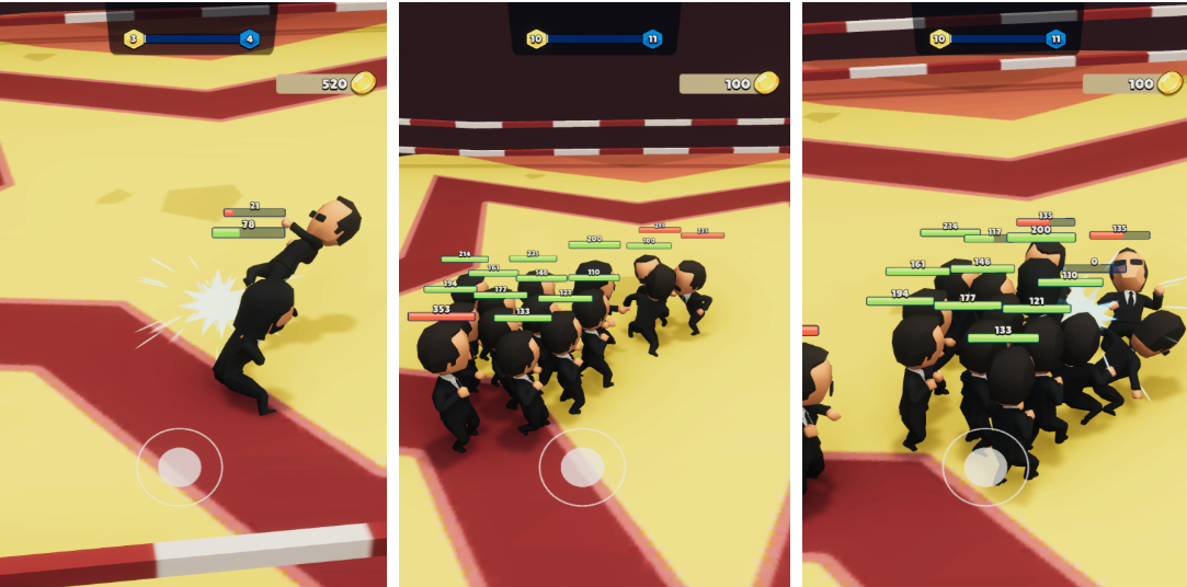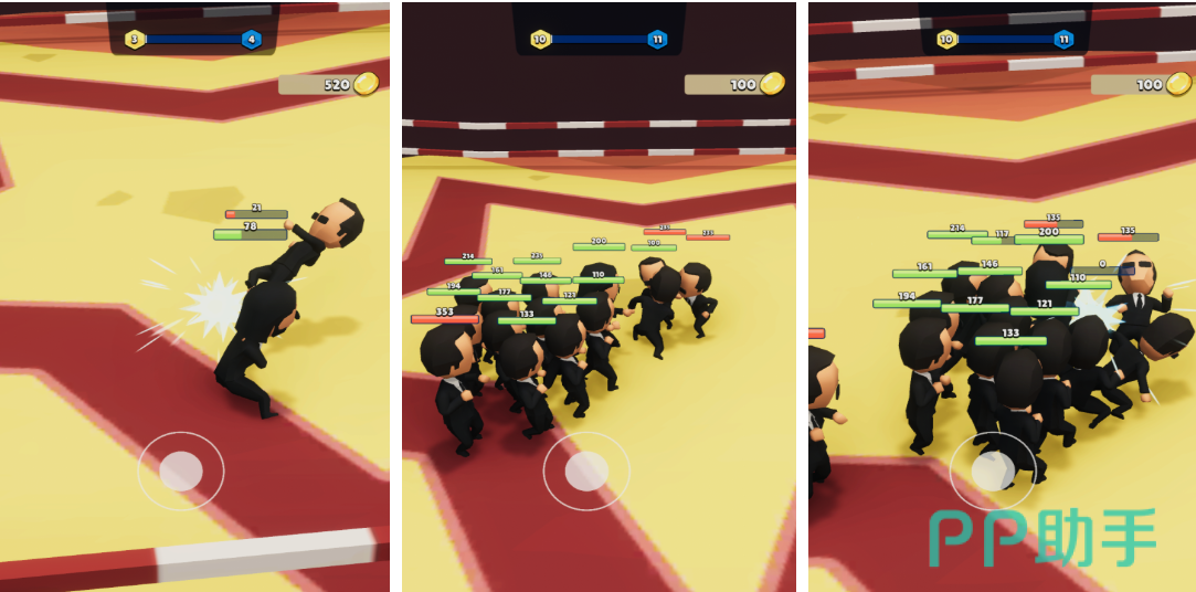 一款聚焦群体作战的动作策略游戏。玩家指挥多名黑衣格斗者组成小队推进关卡,击败敌方单位后可将其吸纳进己方阵营,实现战力动态扩充。操作响应灵敏,连招反馈清晰,美术采用低多边形软萌风格,在轻松氛围中体现战术纵深,适合喜欢快节奏群战与队伍养成的用户。