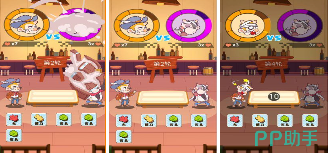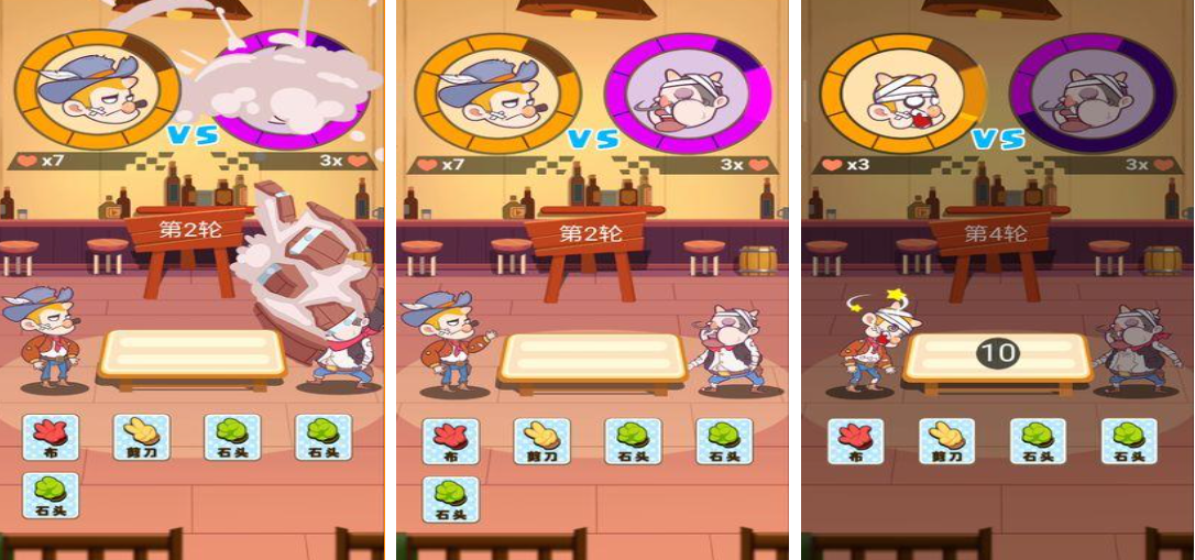 以西部拓荒为背景的猜拳竞技游戏。角色造型融入牛仔、赏金猎人等经典元素,对手AI具备差异化出招习惯。采用动态镜头与夸张表情演出强化戏剧张力,单局节奏明快,适合追求轻松对抗与风格化体验的用户。