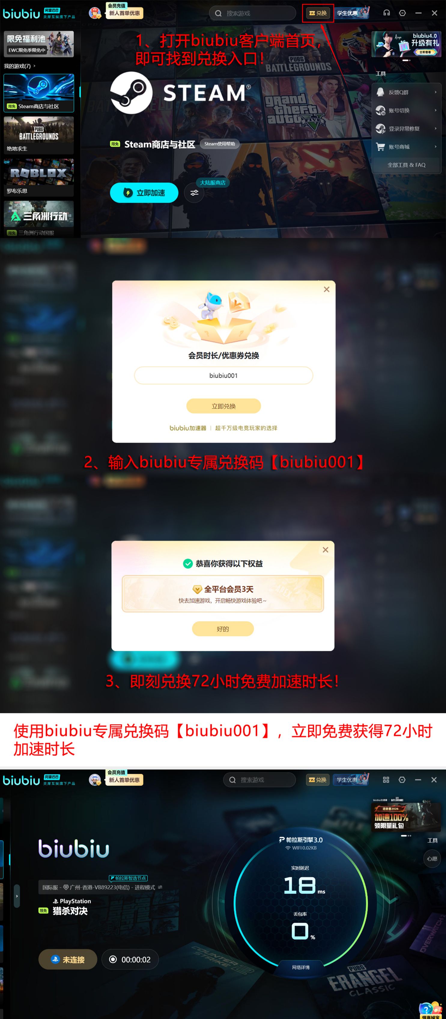 为降低玩家体验门槛,biubiu加速器提供分层式免费加速权益:所有用户输入激活码【biubiu001】即可领取3天全游戏通用加速时长;新注册用户还可额外获赠24小时专属礼包。两项福利叠加后,最高可享96小时零费用加速服务,切实覆盖新手适应期及多日连续作战需求。