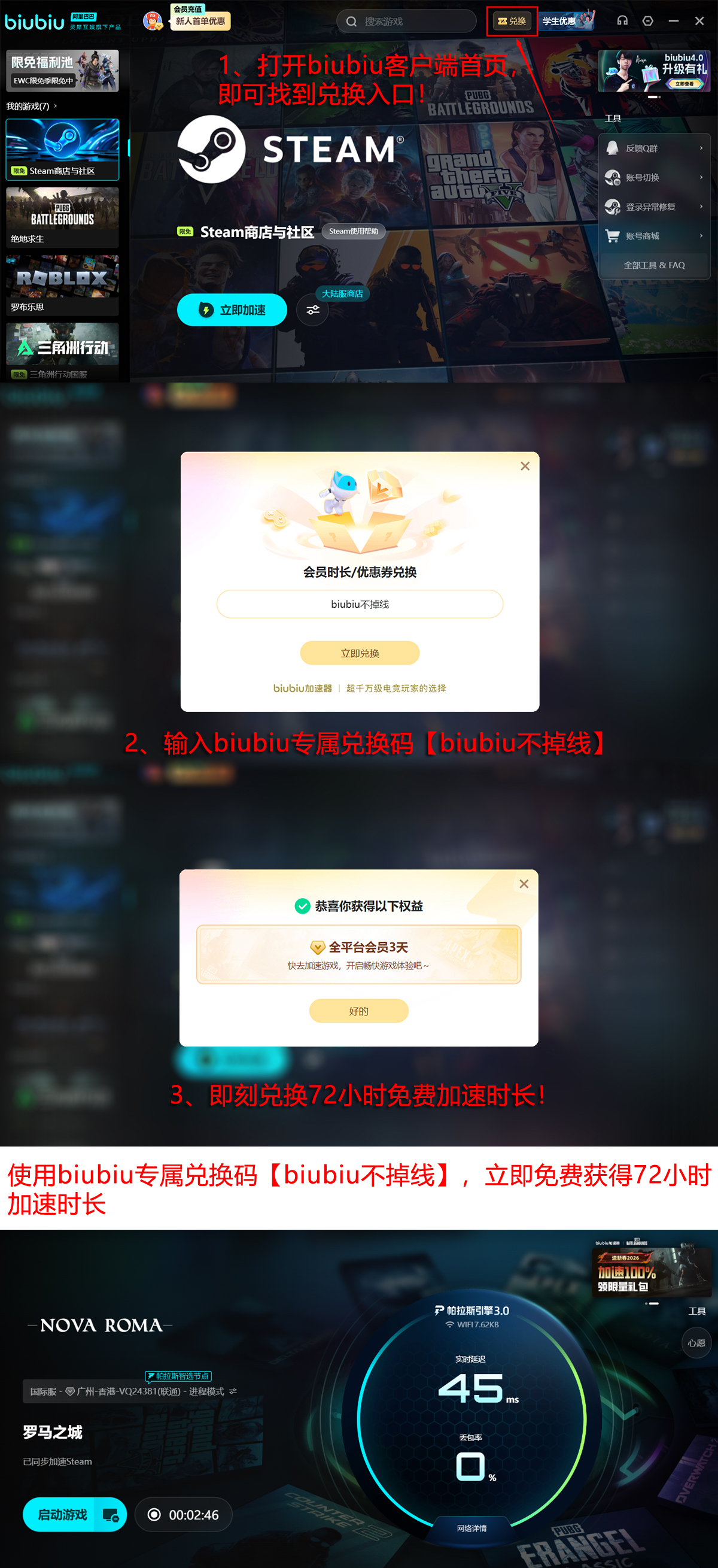 新用户注册后可立即激活首日24小时全功能免费试用权限;在激活过程中输入专属口令【biubiu不掉线】,还可额外获赠72小时加速时长。两项权益叠加,新人总计可享96小时无限制加速服务,足以支撑完整的新手引导、城建体系搭建及首次大规模军团出征全流程。