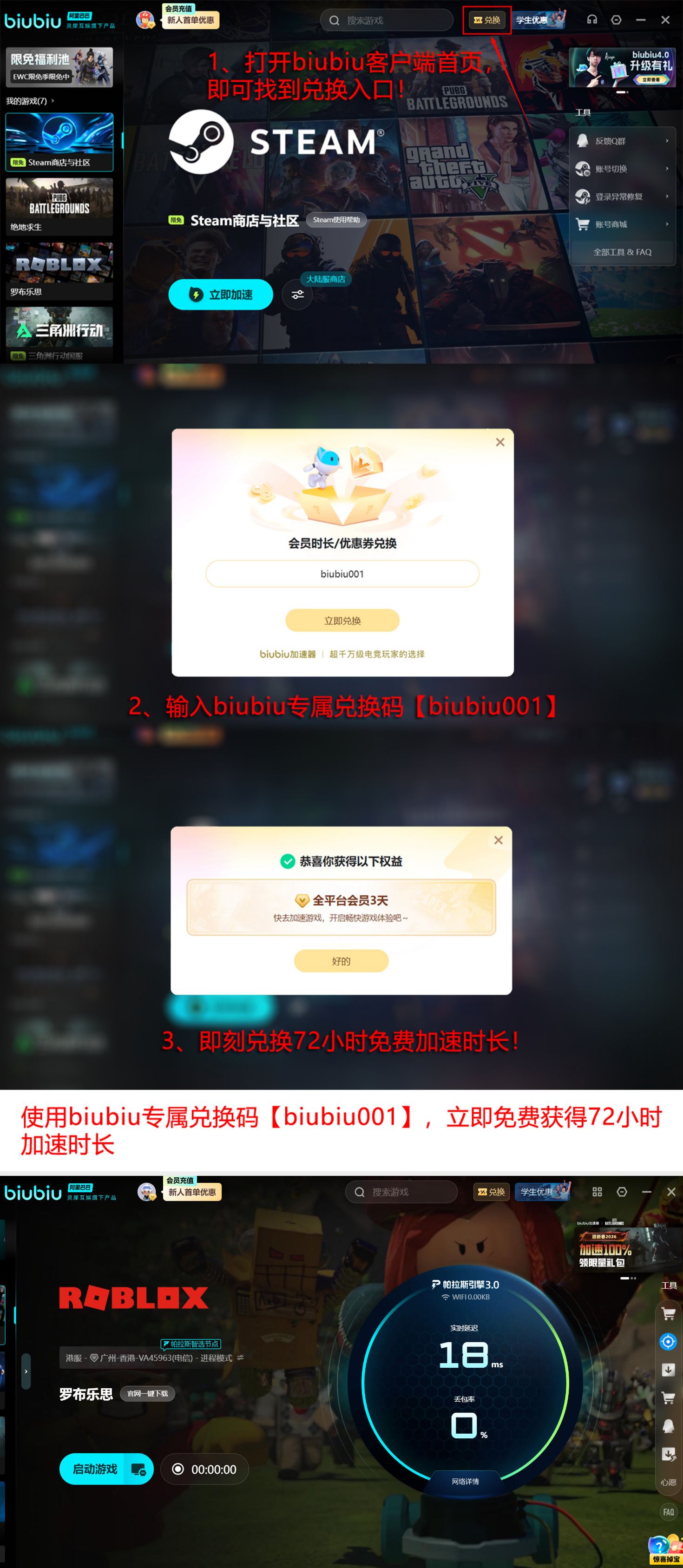 若选择通用加速方案,输入兑换码【biubiu001】可解锁连续3天全游戏加速权限。结合首登赠送的24小时,新人最高可累计获得96小时免费加速服务。所有时长均按自然日计算,不因中途退出而中断计时。