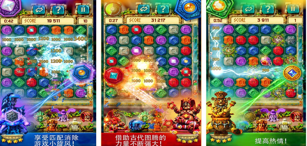 本作为阿兹特克主题动作消除代表作,以炫目宝石爆破特效与倒计时压迫感营造强沉浸氛围。玩家在金光祭坛与图腾石板交错区域执行消除任务,操作极简——点击即触发宝石位移与连锁反应。特殊图腾具备时间缓冲功能,可延缓珠链推进节奏,帮助应对高密度关卡压力。
