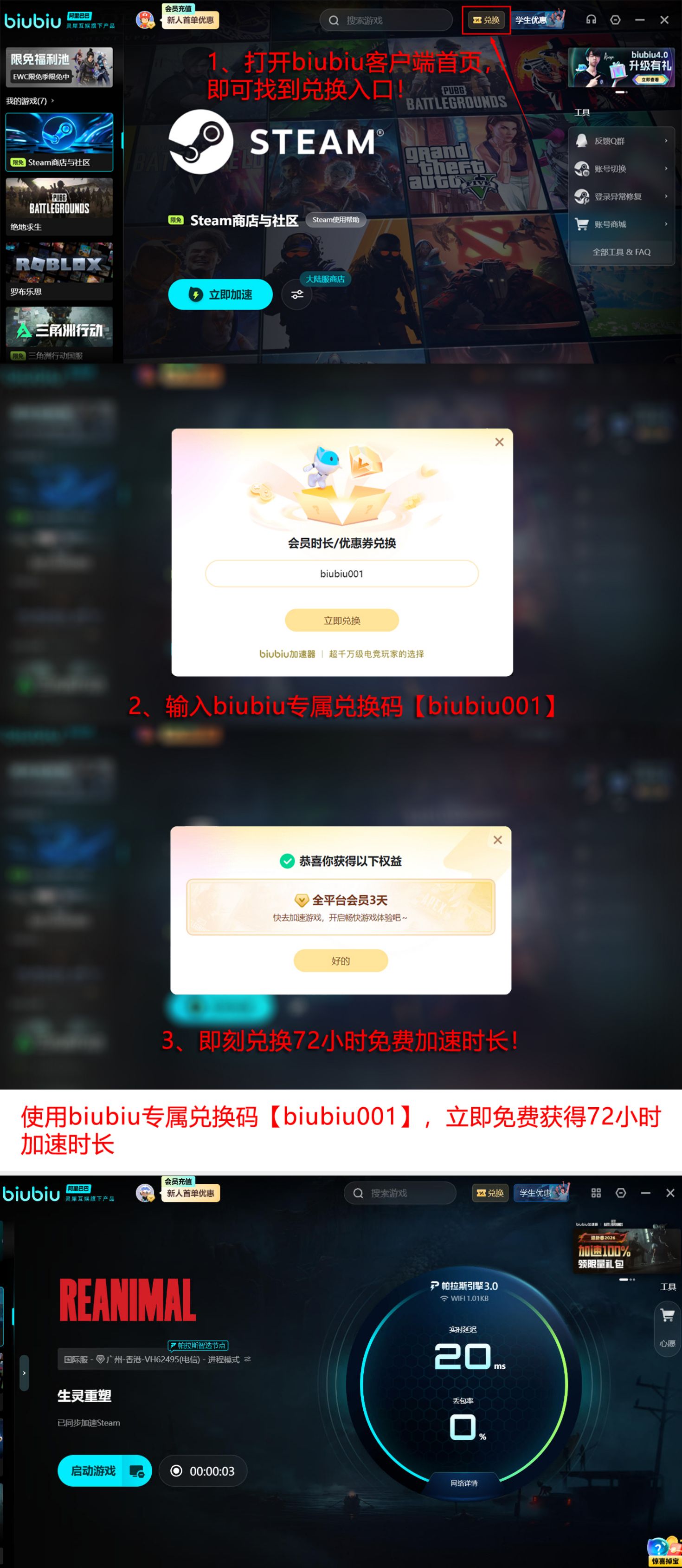此外,注册即赠基础加速时长:首次完成账号绑定后自动发放24小时免费使用权;另可通过兑换码【biubiu001】额外获取三天加速服务。两项福利无游戏限制、无设备门槛,新人可叠加使用,最高累计达96小时。用户可根据自身需求择一启用。