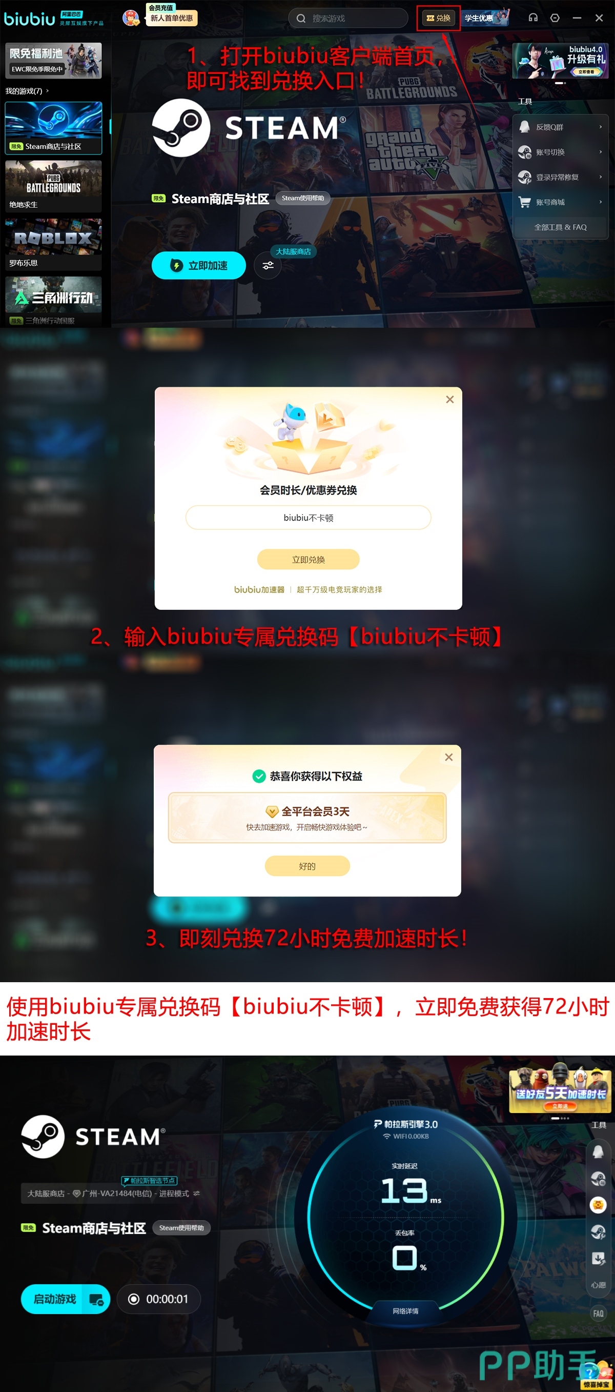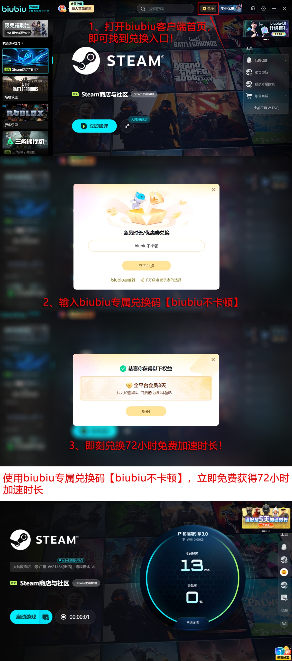 新用户注册即赠24小时全功能免费试用权限;完成首次登录后,输入兑换码【biubiu不卡顿】,可额外获得72小时加速服务时长。该福利面向所有账号开放,新老用户均可领取一次,无设备绑定限制,无需订阅付费计划即可体验完整优化能力。