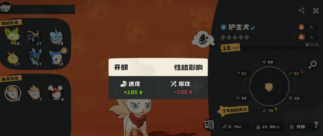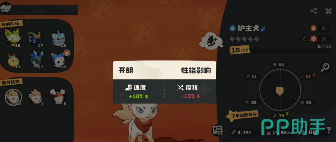 战斗表现上,音速犬在同等级火系精灵中物理攻击成长率位居前列。前期推图阶段,其单体爆发能力突出,能快速清剿多数野生精灵,有效缩短主线任务耗时。核心技能“昂起斗志”具备双重效果:释放时冠毛与尾部呈现动态火焰特效,视觉辨识度强;同时附加1.3倍基础物攻加成,并对目标施加1回合畏缩状态,实战压制力稳定。